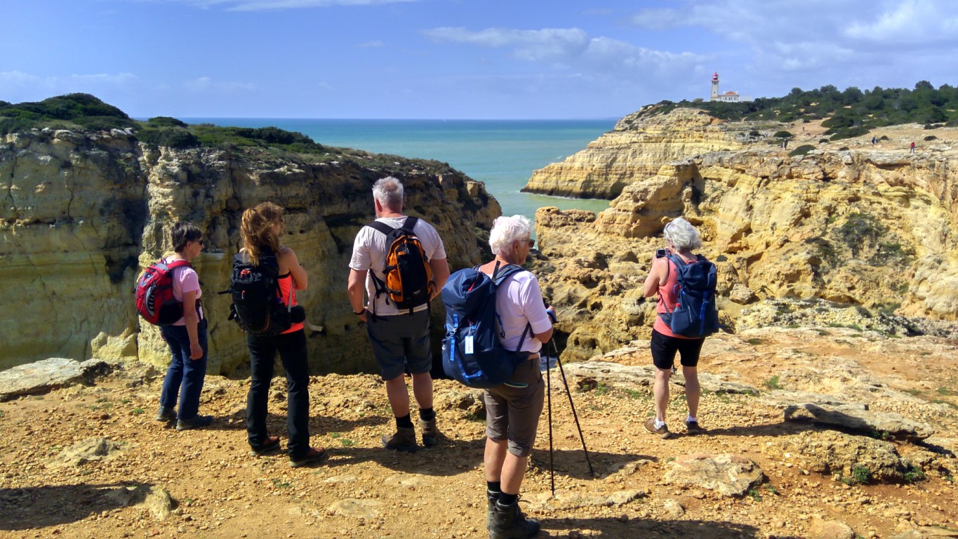 Onze wandeling biedt ons enkele van de mooiste uitzichten van het kustlandschap van de Algarve, gezegend met levendige kleuren en blauw water zover we kunnen zien.